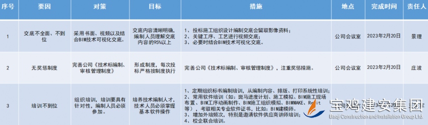 上海大潤發超市的一位清管員浦賽紅,干了一件有點雞毛蒜皮但也算不上驚天動地的大事!滅蚊整整13年,研究出一套“蚊子兵書”,一年不同季節,一天不同時間段,蚊子的生活習性、活動范圍、滅殺招數,掌握得明明白白,有她在的店,夏天光腿進去站上半小時,都沒有一只蚊子來叮咬。為此,我們對這篇讓1.8億人贊嘆的報道做了深入研讀,利用“頭腦風暴法”,集體展開討論,充分發揚民主,各抒己見,集思廣益,全面分析,每個人發表觀點與感想,我們都大受震撼。卻發現了一個不爭的事實!掌握和運用行之有效的統計方法,提高工作效率。這位清管員其實在不經意間運用了一種科學的統計方法:因果圖法!見下圖: 浦賽紅從“5M1E”原因類別入手,即人員、機器、材料、方法、環境、測量,收集各種信息、數據資料,對分析出來的所有末端原因到現場進行測量、試驗、調查分析,找出主要原因,整理分析得出正確結論,制定滅蚊措施。利用科學的統計方法,浦賽紅把這最微不足道的小事,做到了極致,成了“專家”。由此看來,人類從最開始面對事物到逐步認識世界和改造世界的過程中,統計方法起到了重大作用。 在科學技術高速發展的今天,統計方法在潛移默化中得到了日益廣泛和深入的應用。技術管理過程中應用科學的統計方法排列圖法,提高投標施工組織設計審核合格率。見下圖:通過整理近年全公司投標施工組織設計編寫情況,對投標施工組織設計審核結論進行分析、統計、總結。根據排列圖分析,影響標書審核得分的關鍵因素是“投標施工組織設計內容針對性不強”,“項目部、分公司投標負責人或組織人員缺乏系統性部署”其累計頻率已達到77.77%,是主要解決的問題。經過討論、分析,按照PDCA原則,最后制定了相應實施對策與措施,落實責任人和完成時間,對策表見下圖:學習永無止境,在技術管理方面要不斷掌握和應用更多的統計方法,這樣就有利于更好地解決技術問題。除此之外,端正工作態度,提高自身業務水平。立足平凡崗位,從點點滴滴日常工作小事做起,腳踏實地,改變思維,創新工作。從而做到知己知彼,百戰不殆。